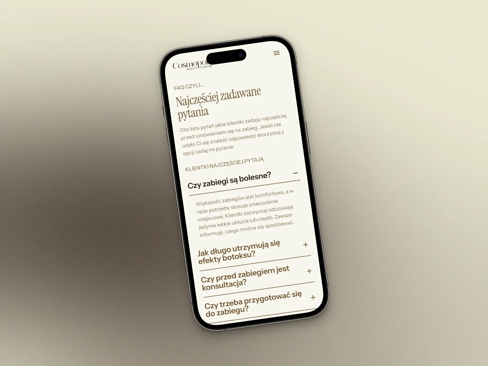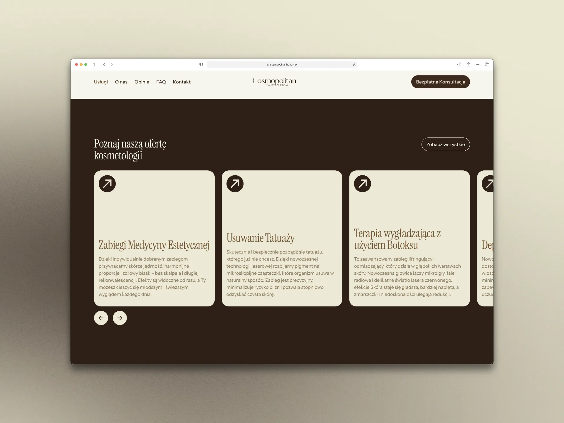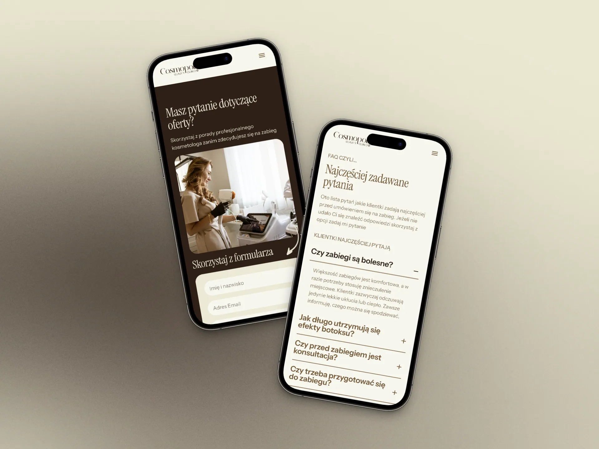 Celem projektu było stworzenie prostej wizytówki dla małego gabinetu medycyny estetycznej. Projekt miał na celu zaprezentowanie mojej klientki w sposób kompetentny oraz umożliwiać prosty kontakt z firmą, w celu umówienia konsultacji. Kolorystyka strony została dobrana tak, aby odróżnić się od konkurencji, u której dominują barwy biała i niebieska.