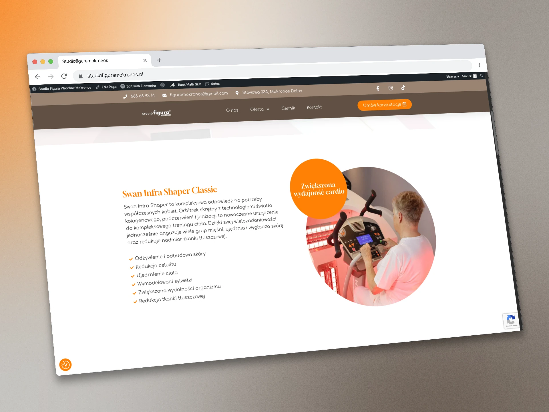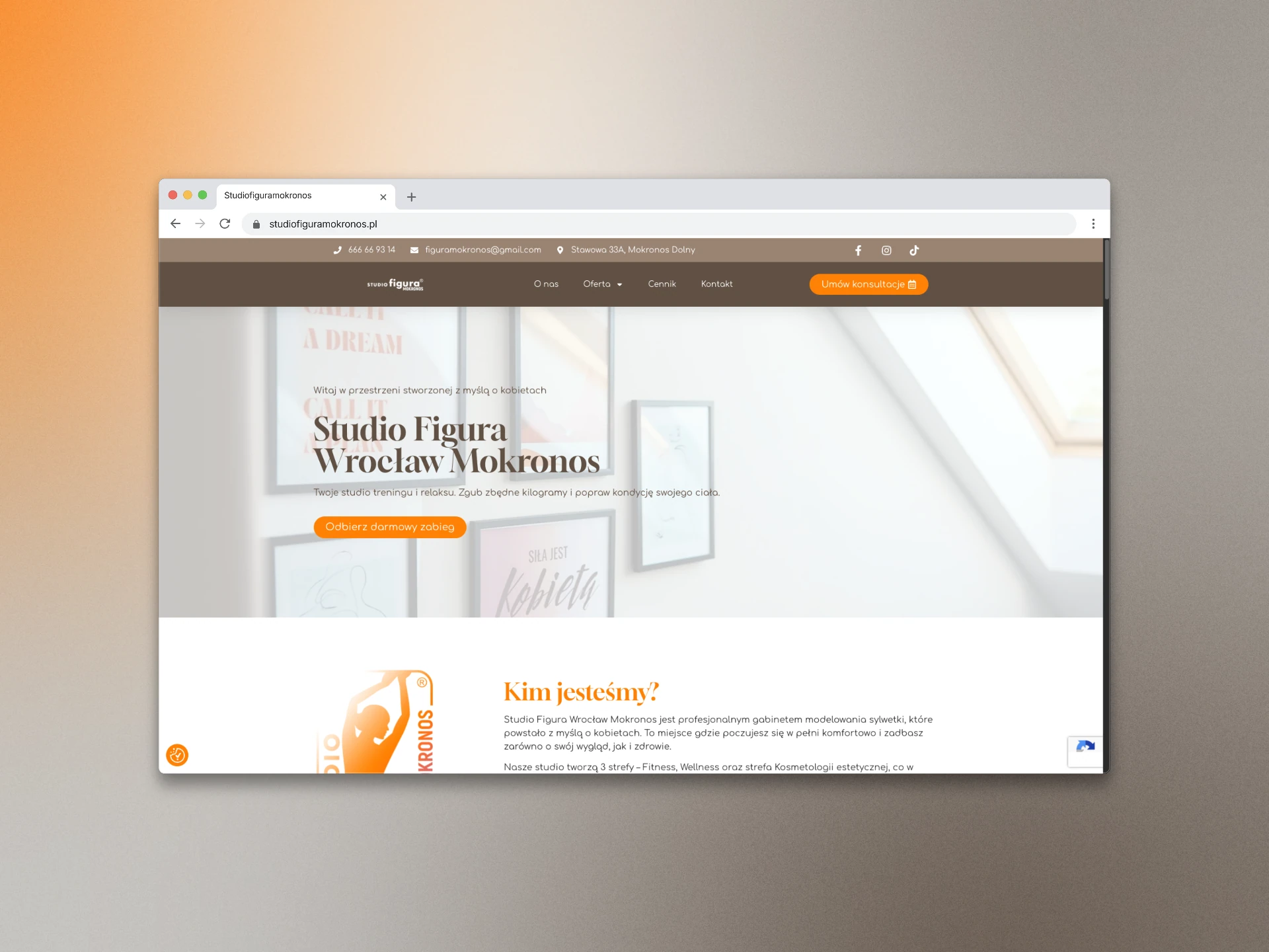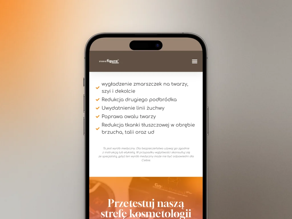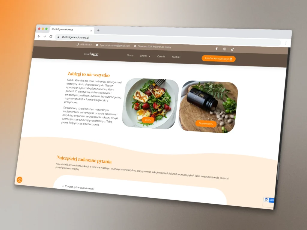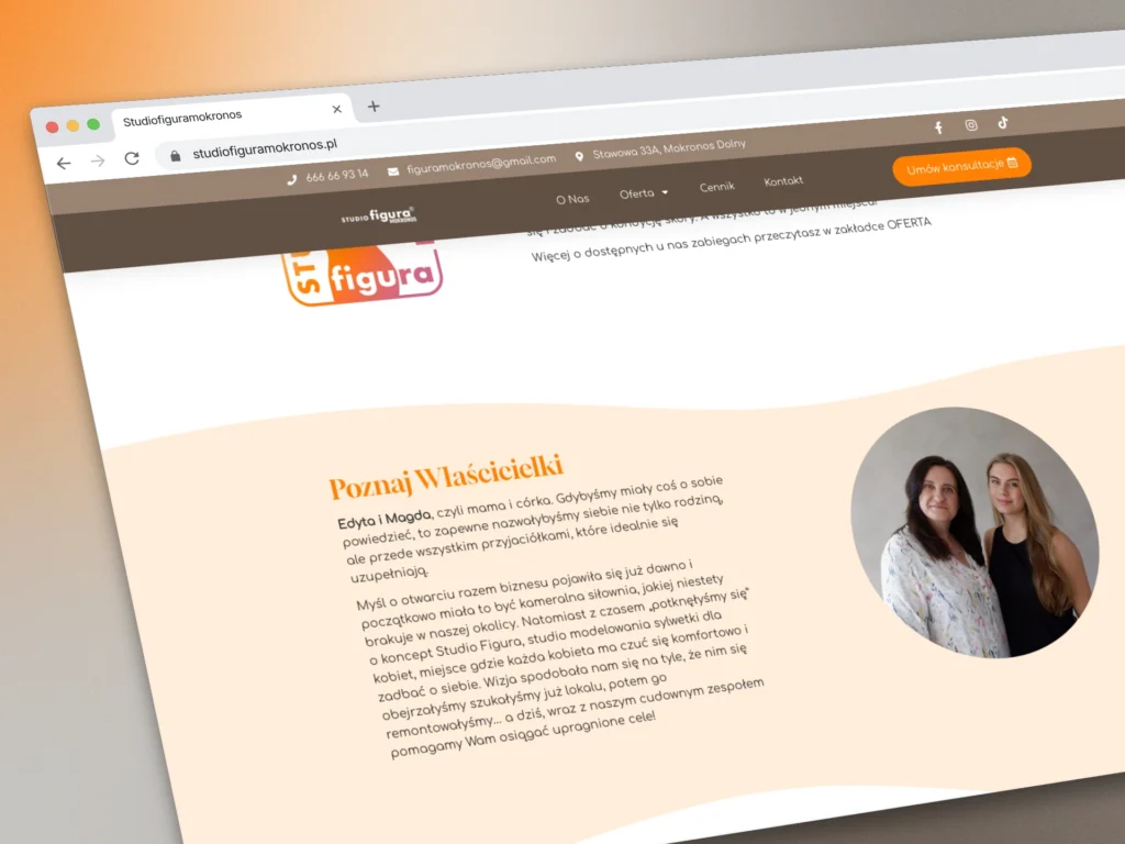 Celem projektu było stworzenie strony, która nie tylko dobrze wygląda, ale przede wszystkim skutecznie generuje leady. Kluczowe było zrozumienie, w jaki sposób Studio Figura Mokronos pozyskuje klientki, i zaprojektowanie intuicyjnej ścieżki użytkownika (user flow), która ułatwia maksymalnie kontakt z firmą. Projekt strony charakteryzuje się nowoczesnym i profesjonalnym designem, który dopasowano do istniejącej identyfikacji wizualnej firmy oraz samego wnętrza Studio.